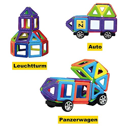 Innoo Tech magnetisches Bauklötze-Set - 76-teiliges Set einschließlich 26 Buchstaben Karten(Abmessung: Quadrat 3.5cmx3.5cm), 2 Fünfecken(Abmessung: Seitenlänge 3.7cm), 2 Paar Rädern(Abmessung: 6.2cmx4cm), 20 Quadrate(Abmessung: Seitenlänge 3.8cm), 22 gleichschenkligen Dreiecken(Abmessung: Seitenlänge 3.2cm) und 4 langen Dreiecken(Abmessung: 3.6cmx7.1cmx7.1cm).