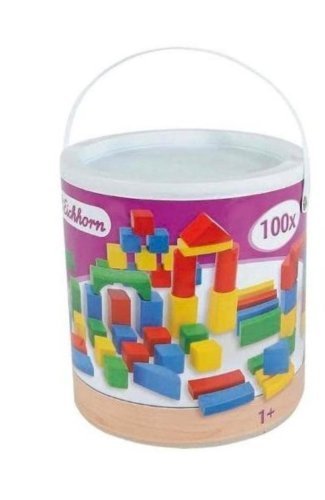 Tragbare Box mit 100 bunten Holzbausteinen für Kinder ab 1 Jahr in der bewährten Eichhorn Qualität.100 Bausteine in verschiedenen Formen und Farben