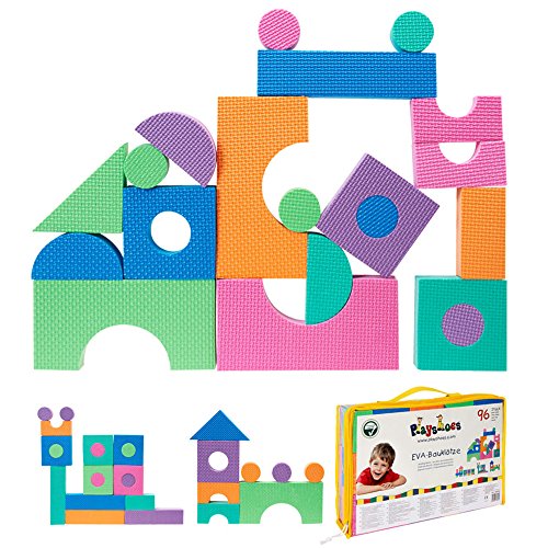 Verschiedene Farben und Formen bunt sortiert. Vorteil: Keine Verletzungsgefahr. 96 Schaumbauklötze in Tragetasche verpackt. Formamid und PAK-Frei. Abbildung ähnlich! Ab 3 Jahren.